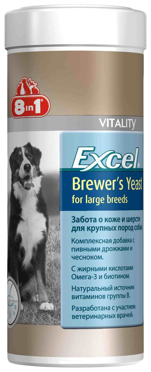 Допустимые отклонения содержания компонентов от предусмотренных по рецептуре должны быть: для микроэлементов — не более 10%, для витаминов — не более 15%. Расфасованы по 80, 140, 260, 780 и 1430 шт. в полимерные банки соответствующей вместимости с навинчиваемыми крышками. Каждую упаковку маркируют на русском языке с указанием: наименования организации-производителя, ее адреса и товарного знака, наименования, назначения и способа применения добавки, состава и гарантированных показателей, срока и условий хранения, номера партии, массы таблетки, количества таблеток в упаковке, даты изготовления, сведений о сертификации, надписи «Для животных» и снабжают инструкцией по применению. Фармакологические (биологические) свойства и эффектыКормовая добавка 8 в 1 Эксель Пивные дрожжи специально создана для собак и кошек и включает компоненты, содержащие витамины, микро- и макроэлементы, полноценные белки, которые предотвращают неблагоприятные последствия дефицита веществ в организме, вызванного несбалансированным кормлением, и необходимы для полноценного функционирования организма собак и кошек. Пивные дрожжи являются источником витаминов группы В и биологически полноценного белка, составляющего более 50% массы дрожжей. В дрожжах содержится 14 витаминов (весь комплекс витаминов группы В, витамин РР, провитамин D), полный комплекс незаменимых аминокислот, ферменты (β-фруктофуранозидаза, глюкозидаза, протеиназа, пептидаза), фосфор и селен. Чеснок содержит биологически активные компоненты и растительные волокна, необходимые для нормального функционирования ЖКТ собак и кошек. Тунцовый жир — источник полиненасыщенных жирных кислот омега-3 (докозагексаеновой и других) и витаминов (A, D3), необходимых организму собак и кошек. Компоненты, входящие в состав добавки, оказывают синергидное действие на организм и полностью удовлетворяют потребности собак и кошек в витаминах, аминокислотах, микро- и макроэлементах. Показания к применению препарата 8 В 1 ЭКСЕЛЬ ПИВНЫЕ ДРОЖЖИ