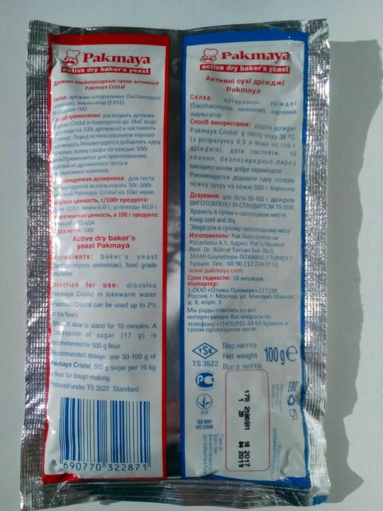 Способ применения: Сухие активные дрожжи “Pakmaya” требуют обязательной предварительной активации, инстантные дрожжи “Pakmaya” возможно применять как с активацией, так и без нее, в сухом виде при перемешивании с мукой.