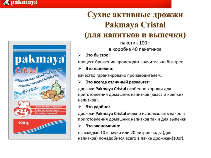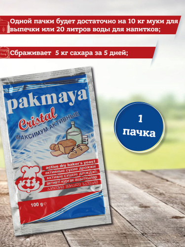 Производитель предлагает две разновидности Пакмайя – хлебопекарные и для приготовления напитков. Последние предназначены именно для постановки браги и имеют приставку Cristal.