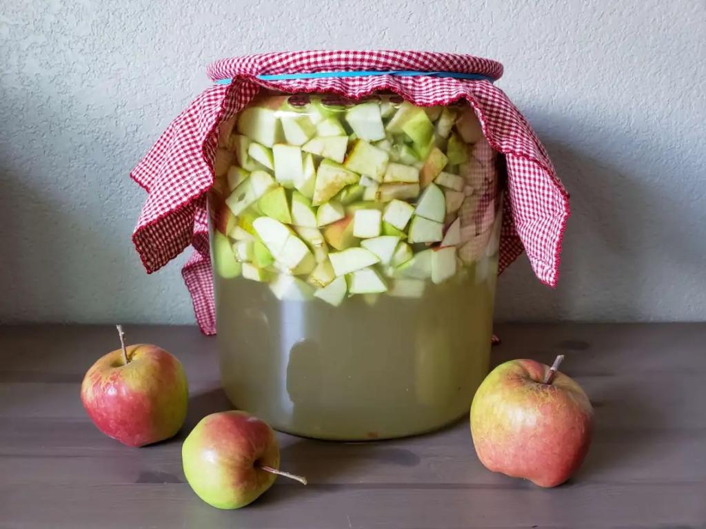 - Не забывайте часто помешивать содержимое, чтобы на поверхности яблок не образовалась корочка. Она препятствует попаданию кислорода, что затрудняет брожение продукта.