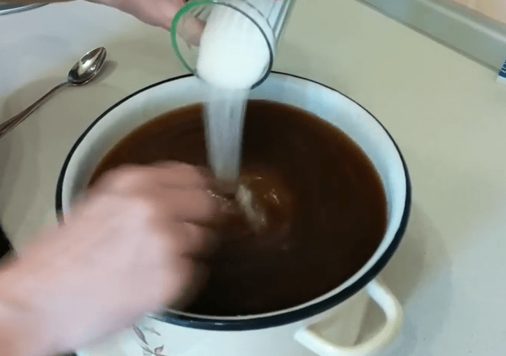 - Растворить сахар в горячем бульоне и остудить до температуры тела. Вмешайте сусло и дрожжи.