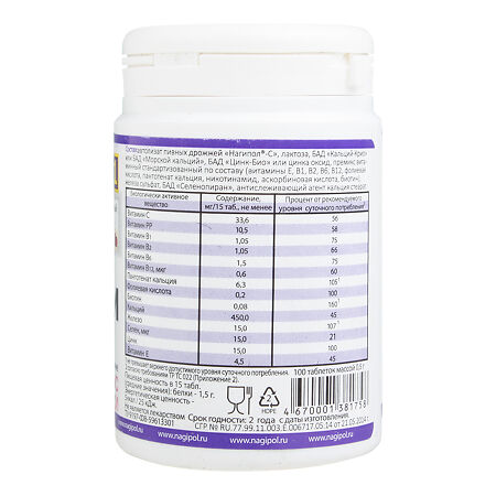 - автолизат пивных дрожжей «Нагипол-С», лактоза, БАД «Кальций-Крио» или БАД «Морской кальций», БАД «Цинк-Био» или цинка оксид, премикс витаминный стандартизированный по составу (витамины Е, В1, В2, В6, В12, фолиевая кислота, пантотенат кальция, никотинамид, аскорбиновая кислота, биотин), железа сульфат, БАД «Селенопиран», антислеживающий агент кальция стеарат.