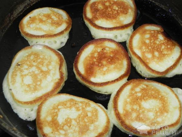 - Как только масло начнет шипеть, набираем большой ложкой жидкое тесто и выкладываем в масло в виде круглых оладушек;