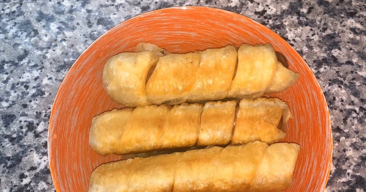 После этого разрезаем его на узкие полоски и раскатываем их, чтобы они были совсем тонкими, ведь слоеное тесто очень хорошо подходит.