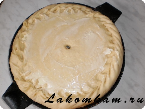 Закройте пирог тестом. Смажьте его взбитым яйцом. Сделайте проколы вилкой.