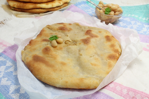 Начинка у пирогов из самых разных продуктов: сыр, брынза, мясо, фасоль, капуста, картофель, ботва свеклы, зелень с сыром. Главное условие начинки должно быть много, а тесто очень тонким. Диаметр таких пирогов 30-40 см, а толщина не более 2 см.