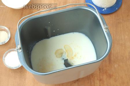 Добавьте все ингредиенты, начиная с молока, в «ведро» (форму для хлеба) хлебопечки. Убедитесь, что дрожжи стоят последними и не касаются молока или соли. Некоторым людям нравится делать небольшую «ямку» поверх муки, чтобы дрожжи удерживались в одном месте до того, как машина запустится.